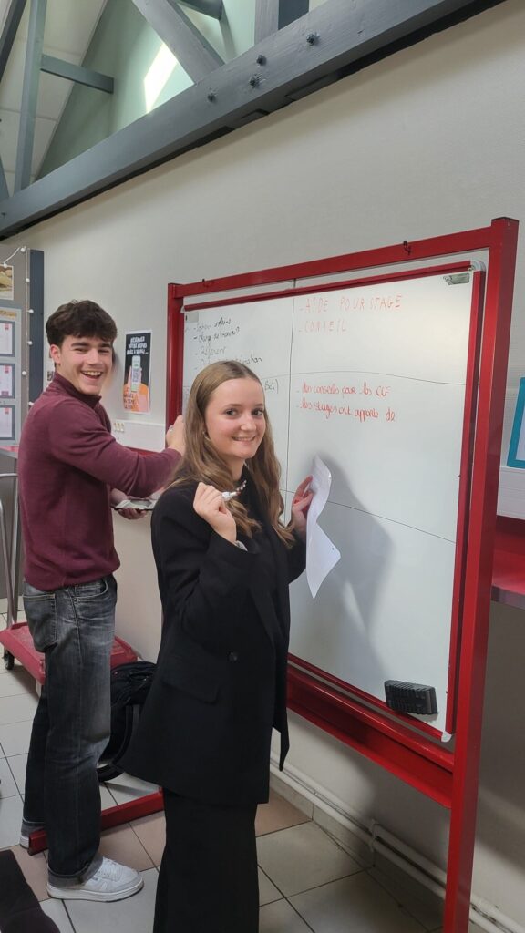 - Réflexion sur le parrainage : les étudiants de 1ères années ont réfléchi par groupe sur « Qu’est-ce que j’attends de mon parrain ? « et ceux de 2èmes années ont fait de même mais sur « Que puis-je apporter à mon filleul ? « . Toutes les idées ainsi recueillies vont permettre d’établir une charte du parrainage.